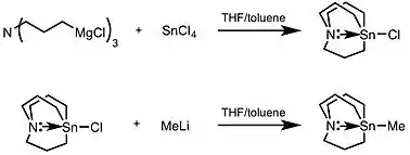The first carbastannatrane was reported in 1984 by Jurkschat and Tzschach.[5] By reaction of an amino-triGrignard reagent with tin(IV) chloride to yield the stannatrane chloride, which was treated with methyl lithium to yield the corresponding methyl stannatrane. Based on a very small methyl J(119Sn–13C) coupling constant of 171 Hz, it was determined that the tin center of methyl stannatrane was indeed pentacoordinate, indicating nitrogen coordination.