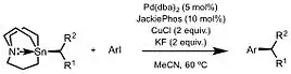 Palladium also catalyzes Stille coupling of secondary alkyl carbastannatranes and aryl electrophiles.[12][13] This report serves as the first example of employing chiral alkyl carbastannatrane reagents in enantioselective synthesis. Related methodology enable selective acyl substitution using enantioenriched stannatranes as an alternative to classical enolate chemistry.[9]
