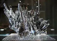 The only stable allotrope of antimony under standard conditions[11] is metallic, brittle, silver-white, and shiny. It crystallises in a trigonal cell, isomorphic with bismuth and the gray allotrope of arsenic, and is formed when molten antimony is cooled slowly. Amorphous black antimony is formed upon rapid cooling of antimony vapor, and is only stable as a thin film (thickness in nanometres); thicker samples spontaneously transform into the metallic form.[12] It oxidizes in air and may ignite spontaneously. At 100 °C, it gradually transforms into the stable form. The supposed yellow allotrope of antimony, generated only by oxidation of stibine (SbH3) at −90 °C, is also impure and not a true allotrope;[13][14] above this temperature and in ambient light, it transforms into the more stable black allotrope.[15][16][17] A rare explosive form of antimony can be formed from the electrolysis of antimony trichloride, but it always contains appreciable chlorine and is not really an antimony allotrope.[13] When scratched with a sharp implement, an exothermic reaction occurs and white fumes are given off as metallic antimony forms; when rubbed with a pestle in a mortar, a strong detonation occurs.