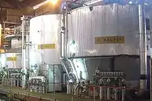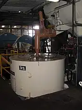 This 'affination sugar' is then brought to the melter. This typically is a round tank of 12 feet diameter and 6 feet height. Here the sugar is mixed with high-purity sweetwater and agitated by paddles.[61] This mixture is heated by steam, melting the crystals in the sweetwater to form a liquor commonly called melt liquor.[62]