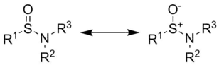 In organosulfur chemistry, sulfinamide is a functional group with the structure R−S(=O)−NR2 (where R = alkyl or aryl).[1] This functionality is composed of a sulfur-carbon (S−C) and sulfur-nitrogen (S−N) single bonds, as well as a sulfur-oxygen double bond (S=O), resulting in a tetravalent sulfur centre (in resonance with its zwitterionic form). As a non-bonding electron pair is also present on the sulfur, these compounds are also chiral. They are sometimes referred to as S-chiral sulfinamides. Sulfinamides are amides of sulfinic acid (R−S(O)OH).