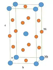• Gamma double prime (γ"): This phase typically is Ni3Nb or Ni3V and is used to strengthen Ni-based superalloys at lower temperatures (<650 °C) relative to γ'. The crystal structure of γ" is body-centered tetragonal (BCT), and the phase precipitates as 60 nm by 10 nm discs with the (001) planes in γ" parallel to the {001} family in γ. These anisotropic discs form as a result of lattice mismatch between the BCT precipitate and the FCC matrix. This lattice mismatch leads to high coherency strains which, together with order hardening, are the primary strengthening mechanisms. The γ" phase is unstable above approximately 650 °C.[13]