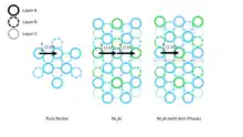 Viewed from a <111> direction, this is the effect of a dislocation along <110> passing through the respective structures. Note how the APB swaps the order of the supercell of alternating nickel and aluminum atoms above the boundary.