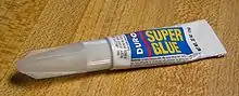 Cyanoacrylates are a family of strong fast-acting adhesives with industrial, medical, and household uses. They are derived from ethyl cyanoacrylate and related esters. The cyanoacrylate group in the monomer rapidly polymerizes in the presence of water to form long, strong chains.[1]