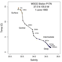 In oceanography, temperature-salinity diagrams, sometimes called T-S diagrams, are used to identify water masses. In a T-S diagram, rather than plotting each water property as a separate "profile," with pressure or depth as the vertical coordinate, potential temperature (on the vertical axis) is plotted versus salinity (on the horizontal axis). As long as it remains isolated from the surface, where heat or fresh water can be gained or lost, and in the absence of mixing with other water masses, a water parcel's potential temperature and salinity are conserved. Deep water masses thus retain their T-S characteristics for long periods of time, and can be identified readily on a T-S plot.[1][2]