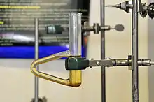 The Thiele tube, named after the German chemist Johannes Thiele, is a laboratory glassware designed to contain and heat an oil bath. Such a setup is commonly used in the determination of the melting point or boiling point of a substance. The apparatus resembles a glass test tube with an attached handle.