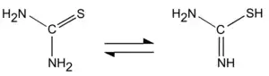 Thioureas have a trigonal planar molecular geometry of the N2C=S core. The C=S bond distance is near 1.71 Å, which is 0.1 Å longer than in normal ketones (R2C=O). The C–N bond distances are short.[1] Thioureas occurs in two tautomeric forms. For the parent thiourea, the thione form predominates in aqueous solutions.[2] The thiol form, known as an isothiourea, can be encountered in substituted compounds such as isothiouronium salts.