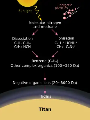 4) by energetic particles and solar radiation. This is followed by the formation of ethylene, ethane, acetylene, hydrogen cyanide, and other small simple molecules and small positive ions. Further reactions form benzene and other organic molecules, and their polymerization leads to the formation of an aerosol of heavier molecules, which then condense and precipitate on the planetary surface below.[10]