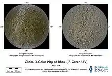 The extensive dark areas on the trailing hemisphere of Saturn's moon Rhea are thought to be deposited tholins.[13]