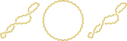Three topoisomers of a closed circular DNA molecule. Left: negatively supercoiled; center: relaxed; right: positively supercoiled