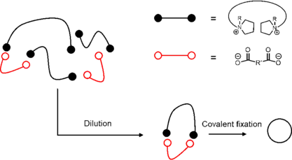 Unlike branched polymer chain synthesis, the synthesis of cyclic polymer is more challenging. General cyclic species involve the combination between two fragments or among several fragments. Electrostatic self-assembly and covalent fixation is one of the most effective strategies to synthesize cyclic topological polymer. The reaction is driven by the electrostatic interactions between telechelic polytetrahydrofurans with cyclic ammonium salt and pluricaboxylate counterions. Upon dilution, the anions and cations could self-assemble into a cyclic structure, followed by a covalent fixation by heat or other external stimuli to undergo ring-opening reaction and close the chain into a cycle.[13]