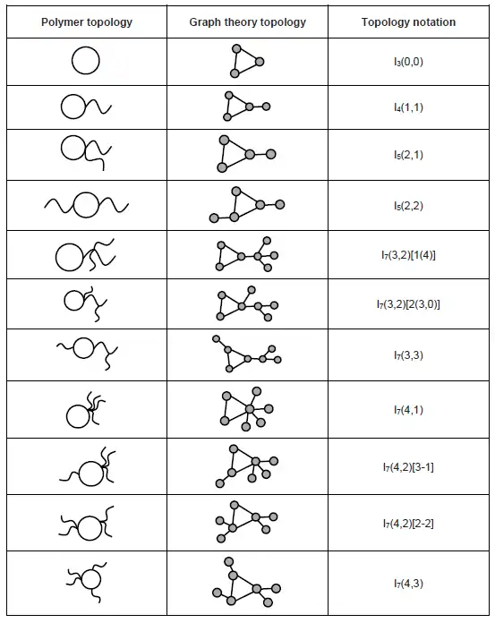 - Capitalized letter represents the main topology within a polymer, represents linear or branched topology, and Roman numerals are used to represent the number of rings in the polymer chain, represents one cycle, represents two cycles, , , , etc. represents three, four, five cycles and so on.