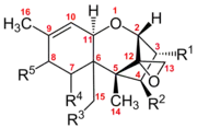 Trichothecenes are a group of over 150 chemically related mycotoxins.[3] Each trichothecene displays a core structure consisting of a single six-membered ring containing a single oxygen atom, flanked by two carbon rings.[4] This core ring structure contains an epoxide, or tricyclic ether, at the 12,13 carbon positions, as well as a double bond at the 9, 10 carbon positions.[5] These two functional groups are primarily responsible for trichothecene ability to inhibit protein synthesis and incur general cytotoxic effects.[6] Notably, this core structure is amphipathic, containing both polar and non polar parts.[7] All trichothecenes are related through this common structure, but each trichothecene also has a unique substitution pattern of oxygen containing functional groups at possible sites on carbons 3,4,7,8, and 15.[5] These functional groups govern the properties of an individual tricothecene and also serve as the basis for the most commonly used classification system for this family of toxins. This classification system breaks up the trichothecene family into four groups: Type A, B, C, and D.