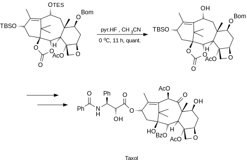 Selective deprotection of silyl groups is possible in many instances. For example, in the synthesis of taxol:[9]