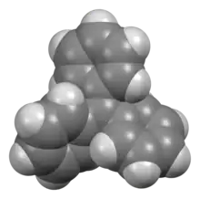 In chemistry, triphenylcarbenium,[1] triphenylmethyl cation, tritylium ,[2] or trityl cation is an ion with formula [C19H15]+ or (C6H5)3C+, consisting of a carbon atom with a positive charge connected to three phenyl groups. It is a charged version of the triphenylmethyl radical (C6H5)3C•. The name is often abbreviated to triphenylmethyl or trityl in salts, although these names also denote the chemical group in compounds like triphenylmethyl chloride that do not contain the cation.[3]