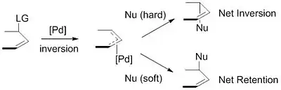 The nucleophiles used are typically generated from precursors (pronucleophiles) in situ after their deprotonation with base.[9] These nucleophiles are then subdivided into "hard" and "soft" nucleophiles using a paradigm for describing nucleophiles that largely rests on the pKas of their conjugate acids. "Hard" nucleophiles typically have conjugate acids with pKas greater than 25, while "soft" nucleophiles typically have conjugate acids with pKas less than 25.[10] This descriptor is important because of the impact these nucleophiles have on the stereoselectivity of the product. Stabilized or "soft" nucleophiles invert the stereochemistry of the π-allyl complex. This inversion in conjunction with the inversion in stereochemistry associated with the oxidative addition of palladium yields a net retention of stereochemistry. Unstabilized or "hard" nucleophiles, on the other hand, retain the stereochemistry of the π-allyl complex, resulting in a net inversion of stereochemistry.[11]