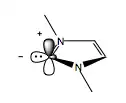 N-heterocyclic carbenes are similar to cyanide in reactivity. Like cyanide, they have an unusual chemical ambivalence, which allows them to trigger umpolung in reactions where they are involved. The carbene has six electrons - two each in the carbon-nitrogen single bonds, two in its sp2-hybridized orbital, and an empty p-orbital. The sp2 lone pair acts as an electron donor, whereas the empty p-orbital is capable as acting as an electron acceptor.