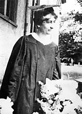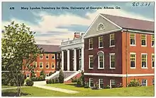 With students limited to white males for the first century of its history, the University of Georgia began admitting white female students during the summer of 1903 as postgraduate students to the State Normal School established in 1893 a few miles west of the campus. When the University of Georgia established a graduate school in 1910, female students were permitted to attend summer classes and some were also unofficially allowed to attend regular classes, as well.[36] However, at that time only junior college transfers majoring in Home Economics were integrated into regular courses.[33] Before official admission of women to the university, several women were able to complete graduate degrees through credit earned during the summer sessions. The first white woman to earn such a degree was Mary Dorothy Lyndon. She received a Master of Arts degree in 1914.[37] Women were admitted as full-time undergraduates in 1918. Mary Ethel Creswell earned a Bachelor of Science in home economics in June 1919, becoming the first woman to earn an undergraduate degree at the university.[37][38] Two UGA dormitories were later named after these graduates: Mary Lyndon Hall[39] and Creswell Hall.[40]