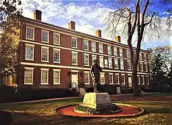 Because Baldwin was elected to the U.S. Senate, the school needed a new president. Baldwin chose his former student and fellow professor at Yale, Josiah Meigs, as his replacement. Meigs became the school's president, as well as the first and only professor. After traveling the state to recruit a few students, Meigs opened the school with no building in the fall of 1801. The first school building patterned after Yale's Connecticut Hall was built the year later. Yale's early influence on the new university extended into the classical curriculum with emphasis on Latin and Greek.[21] By 1803, the students formed a debate society, Demosthenian Literary Society.[24] Meigs had his first graduating class of nine by 1804.[21] In 1806, the school dedicated the first legacy building, Franklin College (named after Benjamin Franklin). The building is now known as Old College.[24]