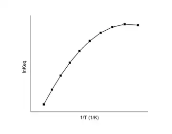 For a reversible reaction, the equilibrium constant can be measured at a variety of temperatures. This data can be plotted on a graph with ln Keq on the y-axis and 1/T on the x axis. The data should have a linear relationship, the equation for which can be found by fitting the data using the linear form of the Van 't Hoff equation