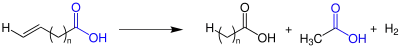 Further insight is obtained by study of the Varrentrapp reaction for the conversion of oleic acid to palmitic acid. If the reaction is quenched before formation of the acetate, the recovered C18 acid consists of numerous isomers of octadecenoic acid (but not α,β-octadecenoic acid).[2] This observation suggests that the base (KOH) isomerizes the double bond. It is speculated that this occurs via deprotonation of the allylic C-H's.[4]