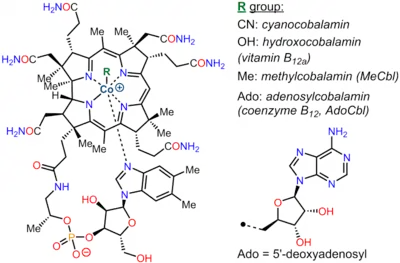 Vitamin B12 is a coordination complex of cobalt, which occupies the center of a corrin ligand and is further bound to a benzimidazole ligand and adenosyl group.[17] A number of related species are known and these behave similarly, in particular all function as vitamins. This collection of compounds is sometimes referred to as "cobalamins". These chemical compounds have a similar molecular structure, each of which shows vitamin activity in a vitamin-deficient biological system, they are referred to as vitamers. The vitamin activity is as a coenzyme, meaning that its presence is required for some enzyme-catalyzed reactions.[12][18]
