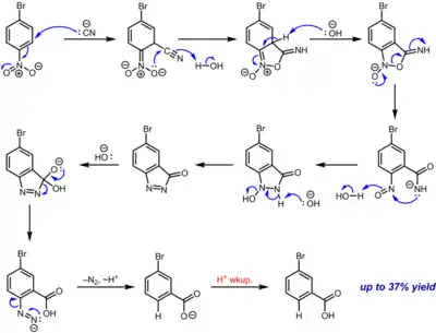 First, the cyanide attacks the carbon ortho to the nitro group. This is followed by ring closure via nucleophilic attack on the cyano group, after which the imidate intermediate is rearomatized. Ring opening via nitrogen–oxygen bond cleavage yields an ortho-nitroso benzamide, which recyclizes to form a compound containing a nitrogen–nitrogen bond. Elimination of water produces a cyclic azoketone, which undergoes nucleophilic attack by hydroxide to form a tetrahedral intermediate. This intermediate collapses with the elimination of the azo group to yield an aryldiazene with an ortho carboxylate group, which extrudes nitrogen gas to afford the anionic form of the observed benzoic acid product, presumably through the generation and immediate protonation of an aryl anion intermediate. The product is isolated upon acidic workup.