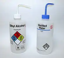 There are a consistent set of colour codes and markings used to identify the contents of wash bottles. Red is used for acetone, White for ethanol or sodium hypochlorite or distilled water, green for Methanol, yellow for isopropanol and blue for distilled water. [1]