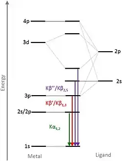 By high-resolution scans of these lines the exact energy level and structural configuration of a chemical compound can be determined. This is because there are only two major electron transfer mechanisms, if we ignore every transfer not affecting valence electrons. If we include the fact that chemical compounds of 3d-transition metals can either be high-spin or low-spin we get 2 mechanisms for each spin configuration.[4]
