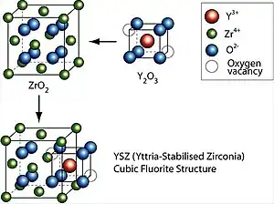 By the addition of yttria to pure zirconia (e.g., fully stabilized YSZ) Y3+ ions replace Zr4+ on the cationic sublattice. Thereby, oxygen vacancies are generated due to charge neutrality:[7]