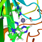 A very large number of metallo-enzymes contain zinc(II). Also many proteins contain zinc for structural reasons. The zinc ion is invariably 4-coordinate with at least three ligands that are amino-acid side-chains. The imidazole nitrogen of a histidine side-chain is a common ligand. The following are typical examples of the two kinds of zinc-protein complexes.