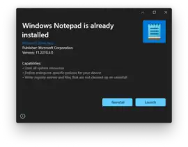 The design for App Installer is similar to the one for the classic Windows Installer, which installs stand-alone MSI files. It shows the app name, the developer, the Start menu tile, and a set of capabilities enabled by the app manifest. If the user clicks the Install button at the bottom right corner, the App Installer checks the app's digital certificate. Unlike a standalone installer, App Installer refuses to install an app without a valid digital certificate.[4] If the certificate is valid, the app displays a blue installation progress bar. It shows the user a button to launch the app once it is fully installed.