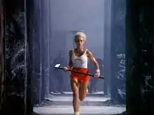 The commercial opens with a dystopian, industrial setting in blue and grayish tones, showing a line of people marching in unison through a long tunnel monitored by a string of telescreens. This is in sharp contrast to the full-color shots of the nameless runner (Anya Major). She looks like a competitive track and field athlete, wearing an athletic "uniform" (red athletic shorts, running shoes, a white tank top with a cubist picture of Apple's Macintosh computer, a white sweat band on her left wrist, and a red one on her right), and is carrying a large brass-headed sledgehammer.[13] Rows of marching minions evoke the opening scenes of Metropolis.