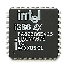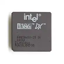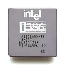 ![]() An Intel i386DX 16 MHz processor with a gray ceramic heat spreader | |