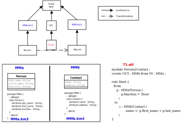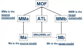 There is an associated ATL Development Toolkit plugin available in open source from the ATL[2] Eclipse Modeling Project (EMP) that implements the ATL transformation language which is inspired by the MOF Query/View/Transformation language QVT.[3] A large library of transformations is available.[4] MOF QVT is a Domain Specific Language for Model Transformation. It supports models conforming to Ecore, EMOF, KM3 (a specific Domain Specific Language for metamodel specification), etc. ATL is also running on MDR/NetBeans.