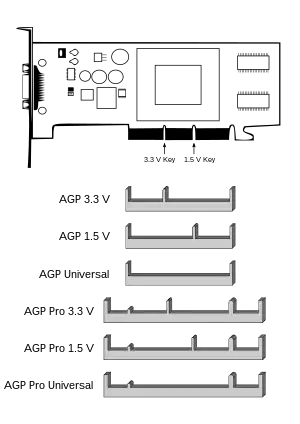 AGP cards are backward and forward compatible within limits. 1.5 V-only keyed cards will not go into 3.3 V slots and vice versa, though "Universal" cards exist which will fit into either type of slot. There are also unkeyed "Universal" slots that will accept either type of card. When an AGP Universal card is plugged-into an AGP Universal slot, only the 1.5 V portion of the card is used. Some cards, like Nvidia's GeForce 6 series (except the 6200) or ATI's Radeon X800 series, only have keys for 1.5 V to prevent them from being installed in older mainboards without 1.5 V support. Some of the last modern cards with 3.3 V support were: