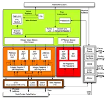 The Fbox is responsible for executing floating-point instructions. It consists of two floating-point pipelines and a floating-point register file. The pipelines are not identical, one executes the majority of instructions and the other only multiply instructions. The adder pipeline has two non-pipelined units connected to it, a divide unit and a square root unit. Adds, multiplies and most other instructions have a 4-cycle latency, a double-precision divide has 16-cycle latency and a double-precision square root has a 33-cycle latency. The floating point register file contains 72 entries, of which 32 are architectural registers and 40 are rename registers.