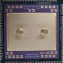 The Alpha 21264E, code-named EV68E, was a cancelled derivative developed by Samsung first announced on 10 October 2000 at Microprocessor Forum 2000 slated for introduction at around mid-2001. Improvements were a higher operating frequency of 1.25 GHz and the addition of an on-die 1.85 MB secondary cache. It was to be fabricated in a 0.18 micrometre CMOS process with copper interconnects.