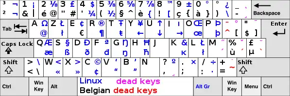 The Windows version of the Belgian keyboard may only support a subset of these characters. Several of the AltGr combinations are themselves dead keys, which are followed by another letter to produce an accented version of that letter.