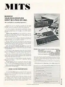The Altair 8800 is a microcomputer designed in 1974 by MITS and based on the Intel 8080 CPU.[2] Interest grew quickly after it was featured on the cover of the January 1975 issue of Popular Electronics[3] and was sold by mail order through advertisements there, in Radio-Electronics, and in other hobbyist magazines.[4][5] According to Harry Garland, the Altair 8800 was the product that catalyzed the microcomputer revolution of the 1970s.[6] It was the first commercially successful personal computer.[7] The computer bus designed for the Altair was to become a de facto standard in the form of the S-100 bus, and the first programming language for the machine was Microsoft's founding product, Altair BASIC.[8][9]