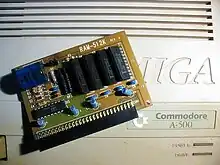 A popular expansion for the Amiga 500 was the Amiga 501 circuit board that can be installed underneath the computer behind a plastic cover. The expansion contains 512 KB RAM configured by default as "Slow RAM" or "trap-door RAM" and a battery-backed real-time clock (RTC).