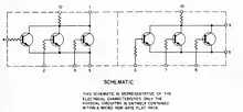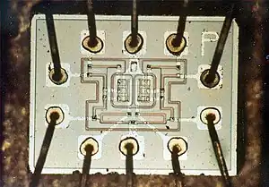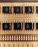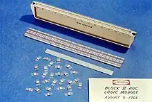 While the Block I version used 4,100 ICs, each containing a single three-input NOR gate, the later Block II version (used in the crewed flights) used about 2,800 ICs, mostly dual three-input NOR gates and smaller numbers of expanders and sense amplifiers.[16]: 27, 266 The ICs, from Fairchild Semiconductor, were implemented using resistor–transistor logic (RTL) in a flat-pack. They were connected via wire wrap, and the wiring was then embedded in cast epoxy plastic.[16]: 129