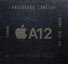 The Apple A12 Bionic is a 64-bit ARM-based SoC that first appeared in the iPhone XS, XS Max and XR, which were introduced on September 12, 2018. It is also used in the third-generation iPad Air, fifth-generation iPad Mini, and the eighth-generation iPad. It has two high-performance cores, which are 15% faster than the A11 Bionic, and four high-efficiency cores, which have 50% lower power usage than the energy-efficient cores in the A11 Bionic.[88] The A12 is manufactured by TSMC[89] using a 7 nm[90] FinFET process, the first to ship in a smartphone.[91][89] It is also used in the 6th generation Apple TV.