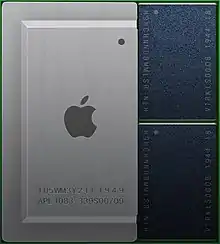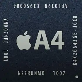 The Apple A4 is a PoP SoC manufactured by Samsung, the first SoC Apple designed in-house.[5] It combines an ARM Cortex-A8 CPU  also used in Samsung's S5PC110A01 SoC[6][7]  and a PowerVR SGX 535 graphics processor (GPU),[8][9][10] all built on Samsung's 45-nanometer silicon chip fabrication process.[11][12] The design emphasizes power efficiency.[13] The A4 commercially debuted in 2010, in Apple's iPad tablet,[8] and was later used in the iPhone 4 smartphone,[14] the fourth-generation iPod Touch, and the 2nd-generation Apple TV.[15]