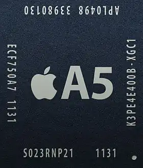 The Apple A5 is an SoC manufactured by Samsung[27] that replaced the A4. The chip commercially debuted with the release of Apple's iPad 2 tablet in March 2011,[28] followed by its release in the iPhone 4S smartphone later that year. Compared to the A4, the A5 CPU "can do twice the work" and the GPU has "up to nine times the graphics performance",[29] according to Apple.