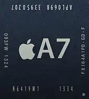 The Apple A7 is a 64-bit PoP SoC whose first appearance was in the iPhone 5S, which was introduced on September 10, 2013. The chip would also be used in the iPad Air, iPad Mini 2 and iPad Mini 3. Apple states that it is up to twice as fast and has up to twice the graphics power compared to its predecessor the Apple A6.[56] The Apple A7 chip is the first 64-bit chip to be used in a smartphone and later a tablet computer.[57]
