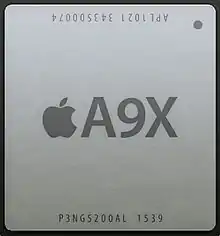 The Apple A9X is a 64-bit SoC that was announced on September 9, 2015, and released on November 11, 2015, and first appeared in the iPad Pro.[79] It offers 80% more CPU performance and two times the GPU performance of its predecessor, the Apple A8X. It is manufactured by TSMC using a 16 nm FinFET process.[80]