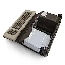 Apple III Plus showing the RFI shield over the floppy drive and the cast aluminum case