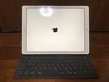 Released in November 2015 alongside the iPad Pro (1st generation), the Smart Keyboard is Apple's first keyboard cover accessory for iPad.[7] It is powered by the iPad's Smart Connector, and does not require separate charging or batteries. Its keys use a butterfly-switch mechanism, with its keys covered by a fabric material. When unfolded, the Smart Keyboard only allows for one viewing angle position; when folded, the Smart Keyboard only protects the front of the iPad.[7] The Smart Keyboard is compatible with iPad Pro models from 2015 to 2017, the iPad Air (3rd generation), and iPad models from 2019 to 2021. At release, it received criticism for its high price tag.[7][8]