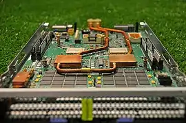 ![]() The Aquasar cooling system applied to a QS22 Blade server module. The two microchannel coolers at the center, are attached directly to the processors, allowing for unprecedented cooling efficiency. | |